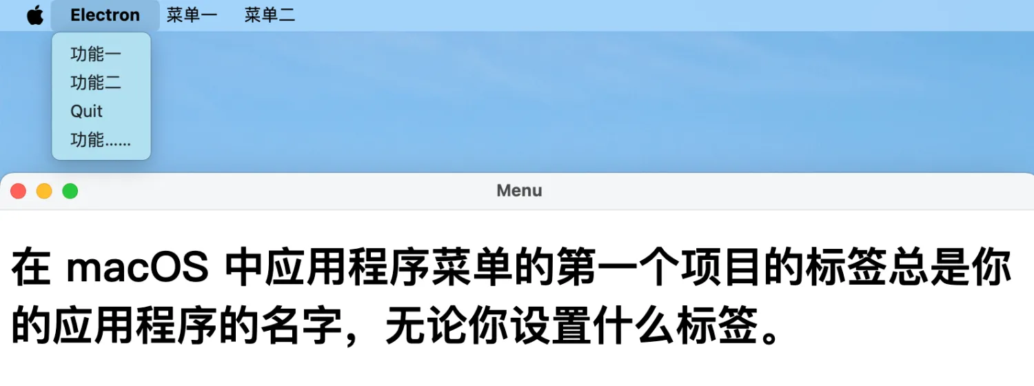 可以看到第一个菜单的标题是 Electron 而不是我们设置的标题 菜单一。这是因为 在 macOS 中应用程序菜单的第一个项目的标签总是你的应用程序的名字,无论你设置什么标签。
