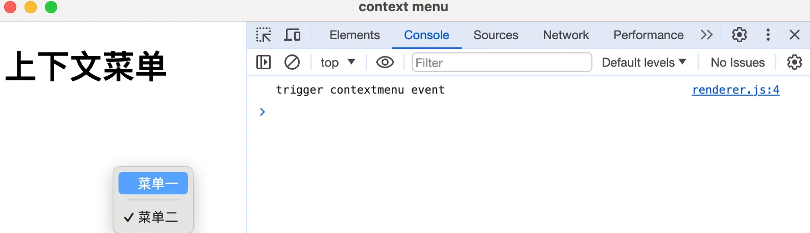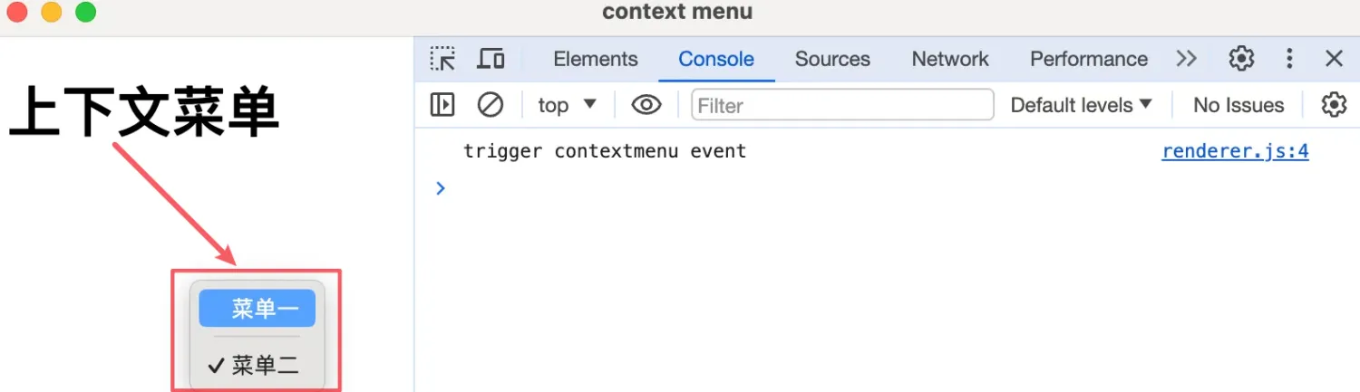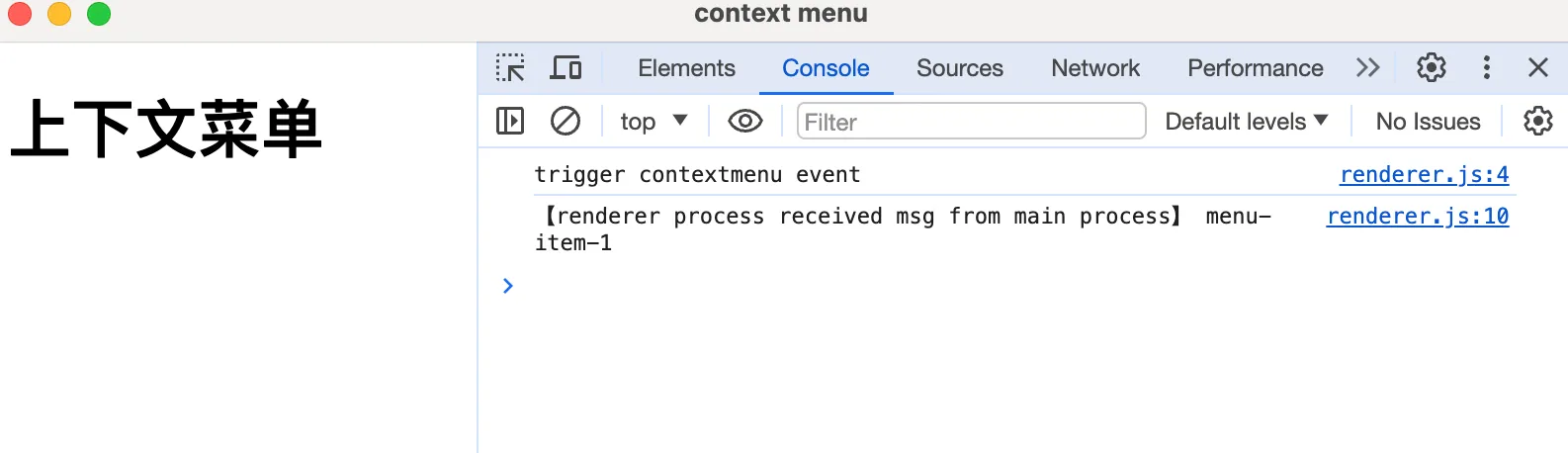 点击【菜单一】,主进程会给渲染进程发一条消息,在控制台中可以看到多了一条日志。