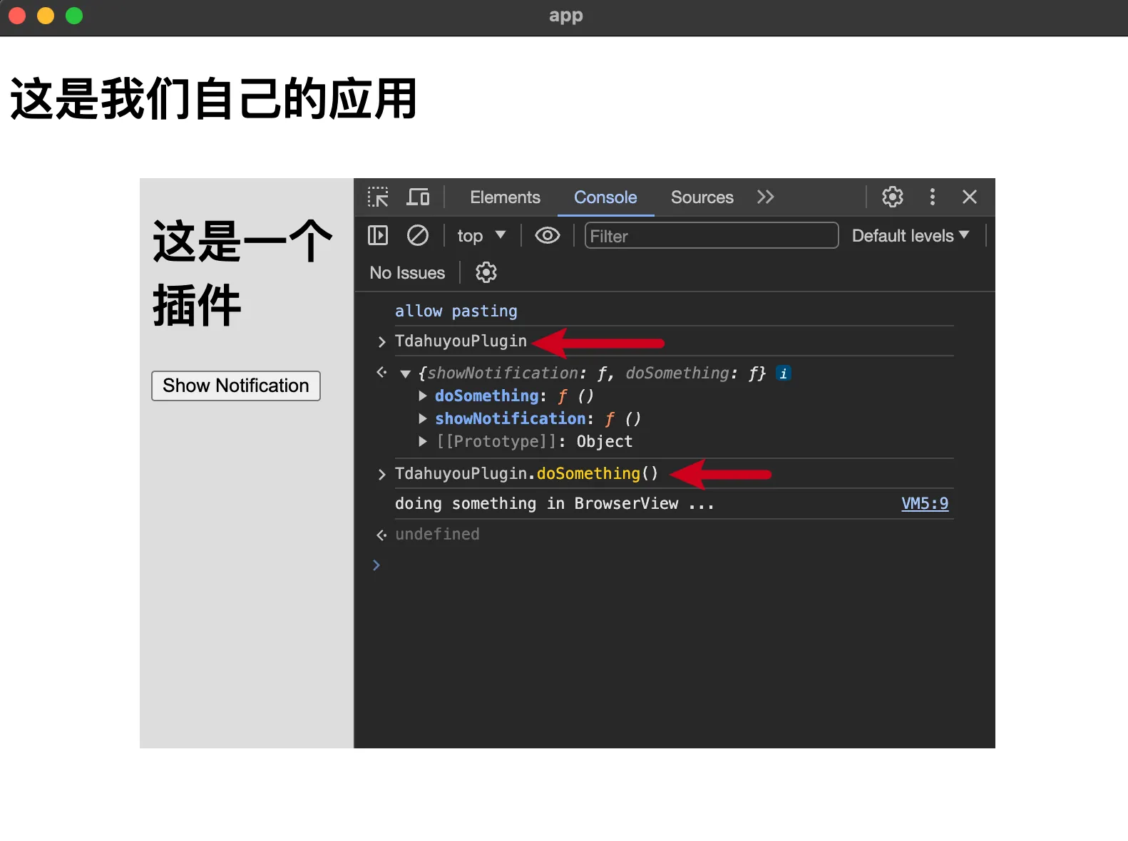 TdahuyouPlugin.showNotification({ title: '提示的标题', body: '提示的内容' }),在 preload 中指定了 API 的名称为 TdahuyouPlugin,用户在使用的时候可以通过这个全局对象访问到那些我们在 preload 中丢到 TdahuyouPlugin 里边的内容。