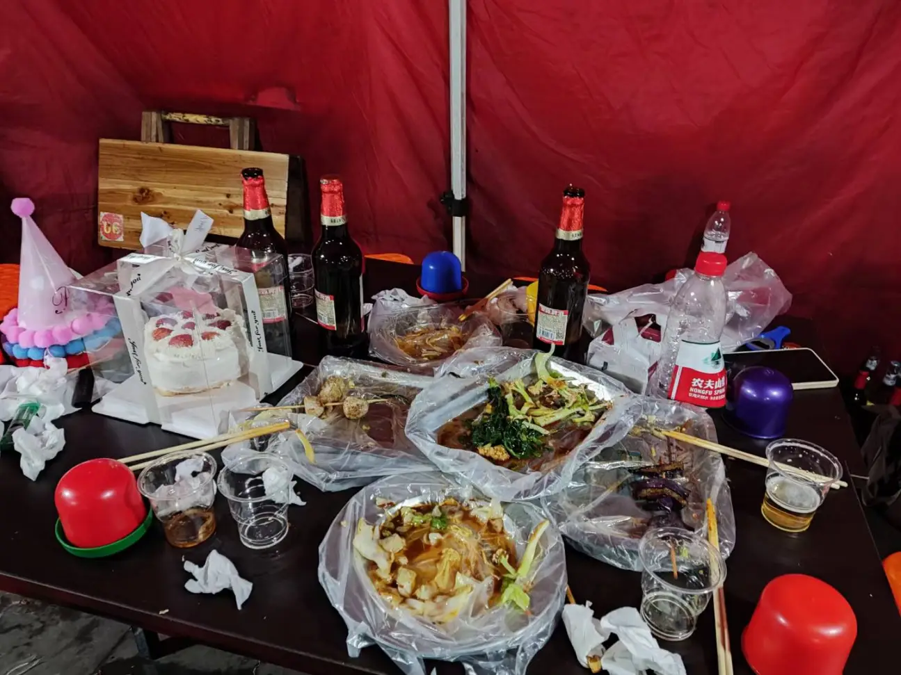 拿着外卖回寝室的路上,身后跟着一群狗,都朝手里的外卖摇尾巴。