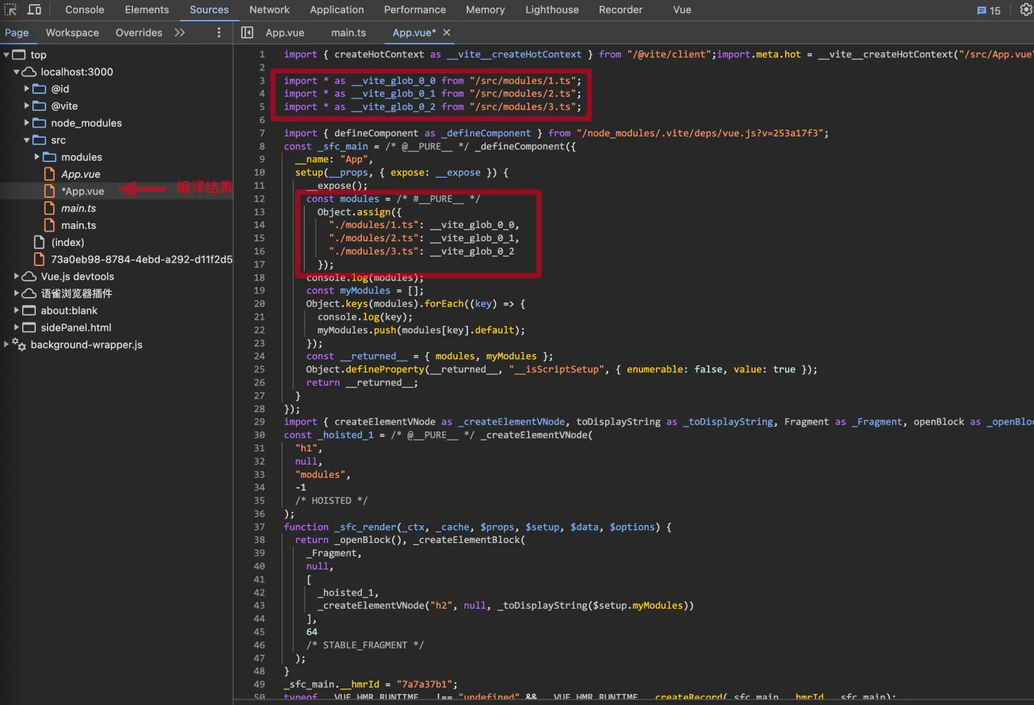 ├── App.vue # 在 App.vue 中,捞出 modules-1 和 modules-2 中的所有 .ts 文件