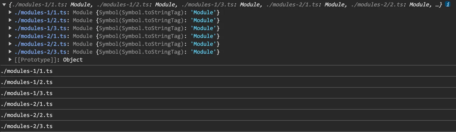 const modules = import.meta.glob(['./modules-1/**/*.ts', './modules-2/*.ts'], {