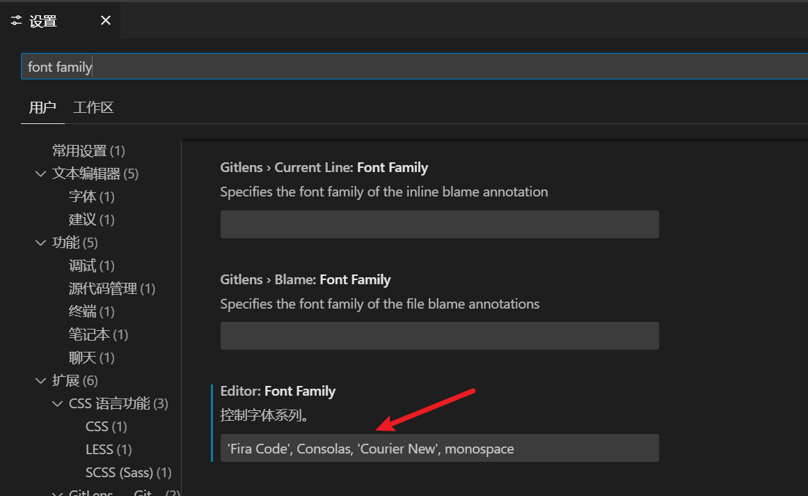 打开 VSCode 设置,搜索 font family