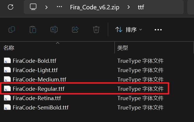 。如果你看到 Fira Code 的字体文件(如FiraCode-Regular.ttf