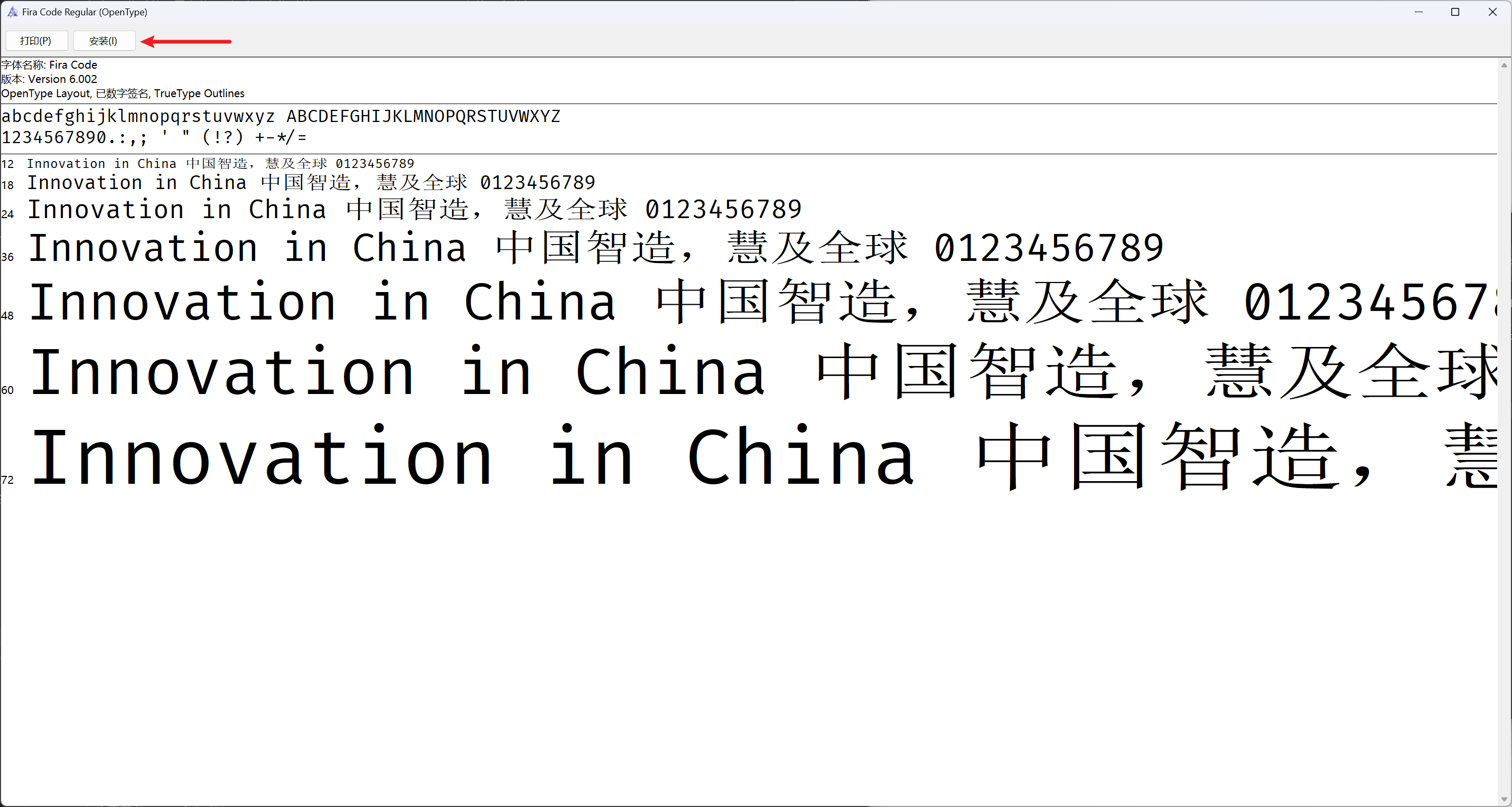 如果发现 Fira Code 字体没有安装,你可以从 Fira Code GitHub 仓库 下载并安装它。下载完成后,双击字体文件并点击“安装”按钮即可。