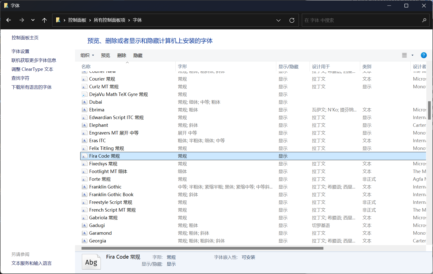 1 - 如果 Fira Code 字体已安装,你会看到相关的字体文件列表。