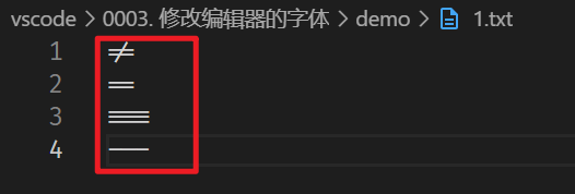 重启 VSCode,如果本地已经安装了 Fira Code 字体,可以通过输入 !=